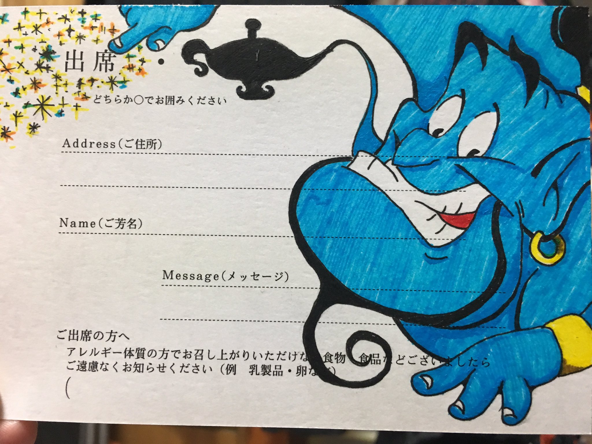 生方太郎 Auf Twitter 従姉妹の結婚式の出欠ハガキをイラスト式にしてみた ディズニー アラジン ジーニー